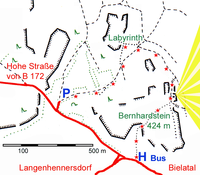 auf der Felskante bleibend, einem Pfad bis zum süd-westlichen Ende des Bernhardsteines folgen. Hier hat man einige schöne Blicke auf die Ortschaft Bielatal, den Kohlberg und Lampertstein. Der Weg von von und zu der Bushaltestelle “Abzw. Langenhennersdorf” empfiehlt sich, wenn man mit dem Linienbus gekommen ist und nicht die schmale Straße bis zum Parkplatz laufen möchte.