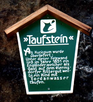 des Gebirgsvereins und an einen Engländer erinnern, der unter dem Felsüberhang 1851 sein Kind mit Jordanwasser taufen ließ. Man kann oben